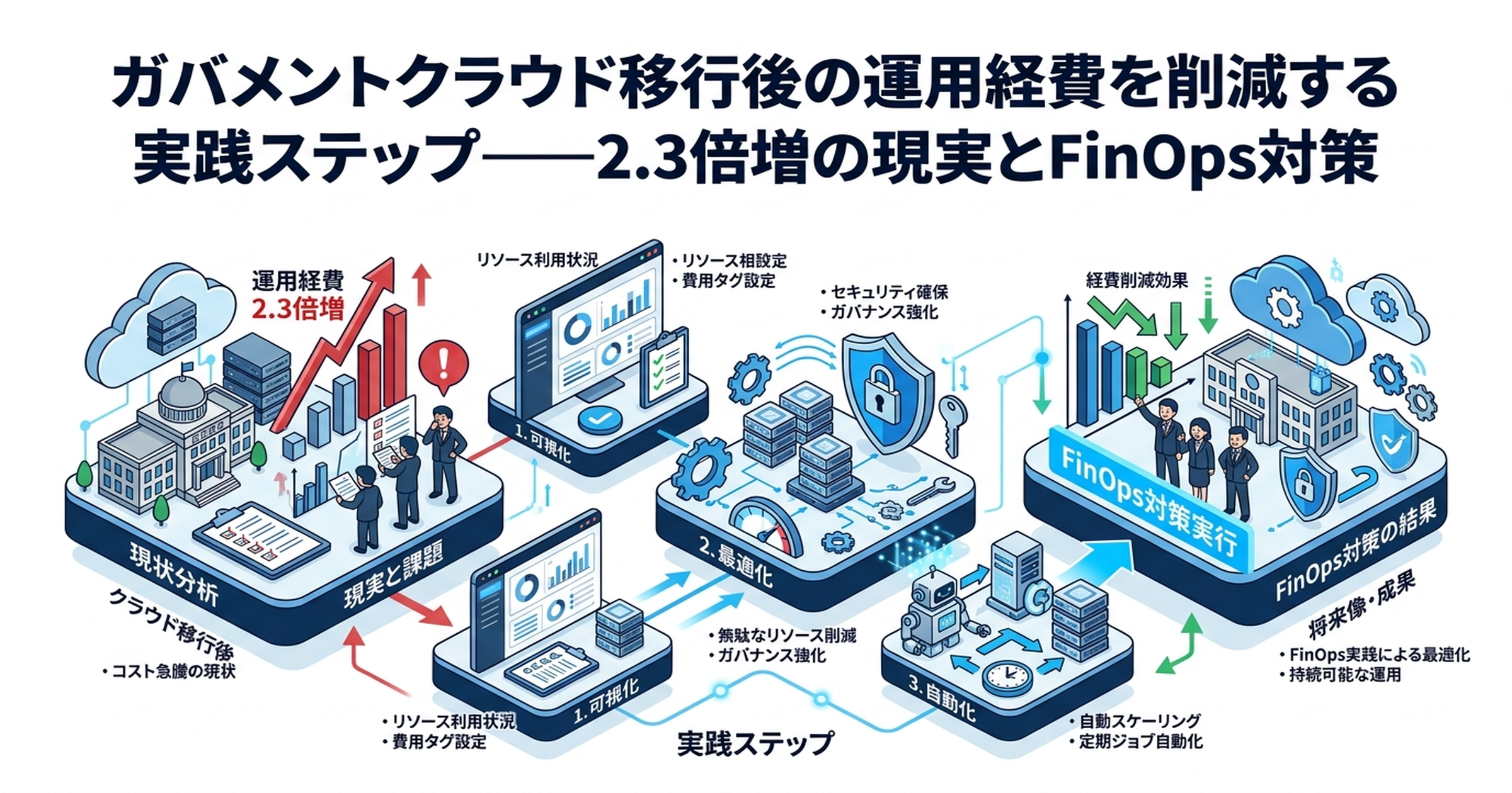 国が掲げる「2018年度比3割削減」の目標は、FinOpsと共同利用の組み合わせによって達成可能な水準です。ただし前提として、移行時の見積適正化(Step 1)を怠ると基準コストが高くなり、その後の削減努力が相殺されてしまいます。